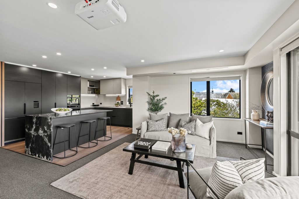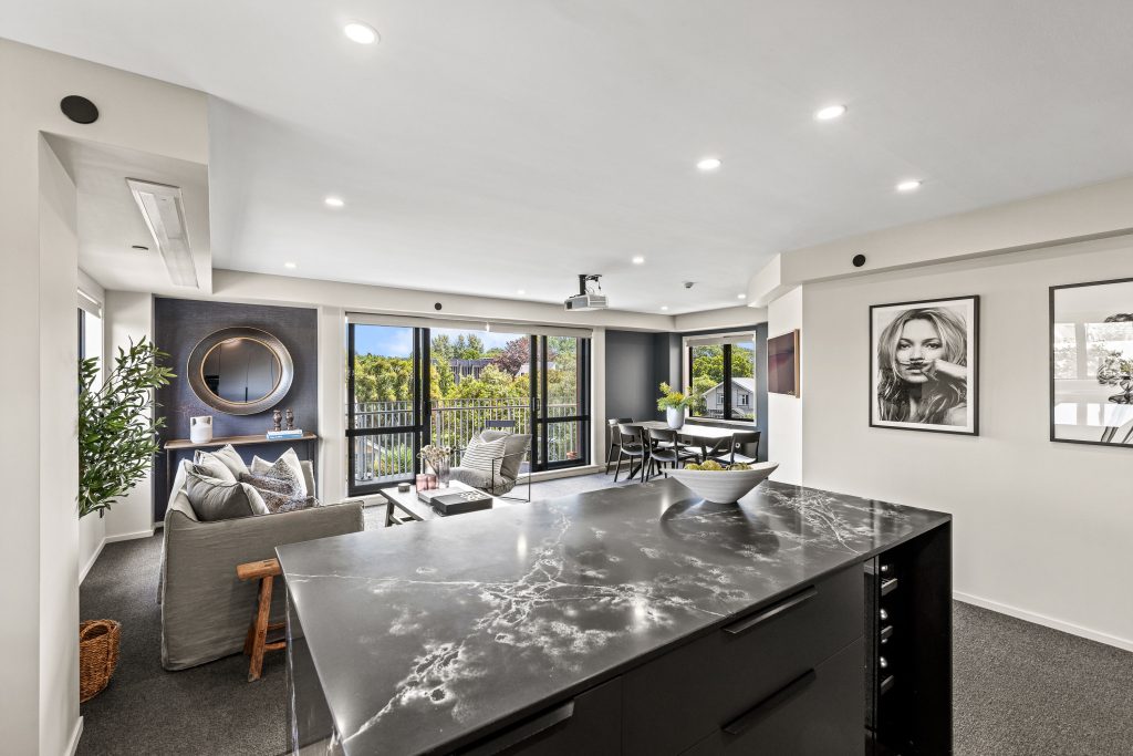 With renovations completed by H+M Builders, the apartment centres on a Modern Age kitchen, where stone benchtops, a substantial island and an elite suite of Fisher & Paykel appliances give it the presence to host and the performance to match.