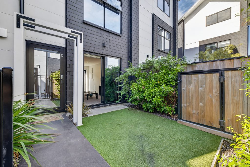 The three-level layout is designed around ease, placing open-plan living at ground level where sliding doors extend to a turfed courtyard with a storage shed, keeping outdoor upkeep to a minimum.