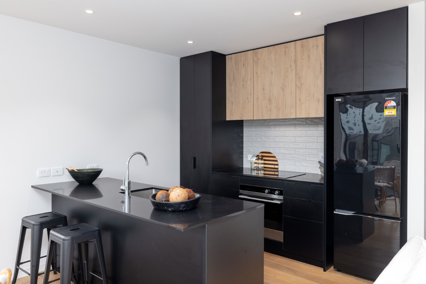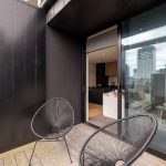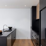 The open-plan kitchen, living and dining room is a spacious social zone, opening to a balcony looking over the common courtyard. Dressed in black, the kitchen’s design is highlighted by a stone-topped island that serves as a versatile centrepiece, ideal for conversation, casual dining, or an efficient workspace.