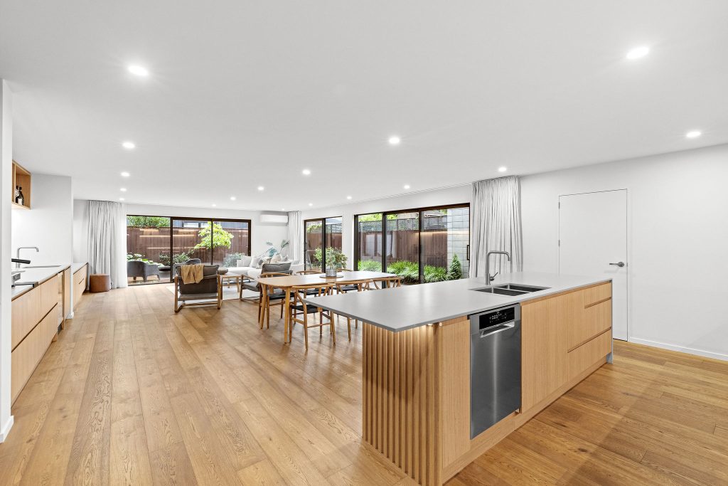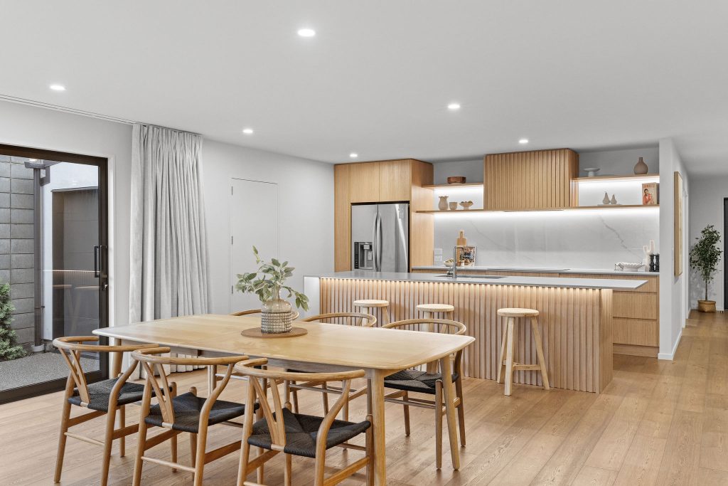 Guided by timber, texture and tone, the open-plan living domain is defined by detail, with a centrepiece kitchen anchoring the dining area and lounge before seamlessly shifting to the deck, where established gardens create a natural backdrop for outdoor living and entertaining.