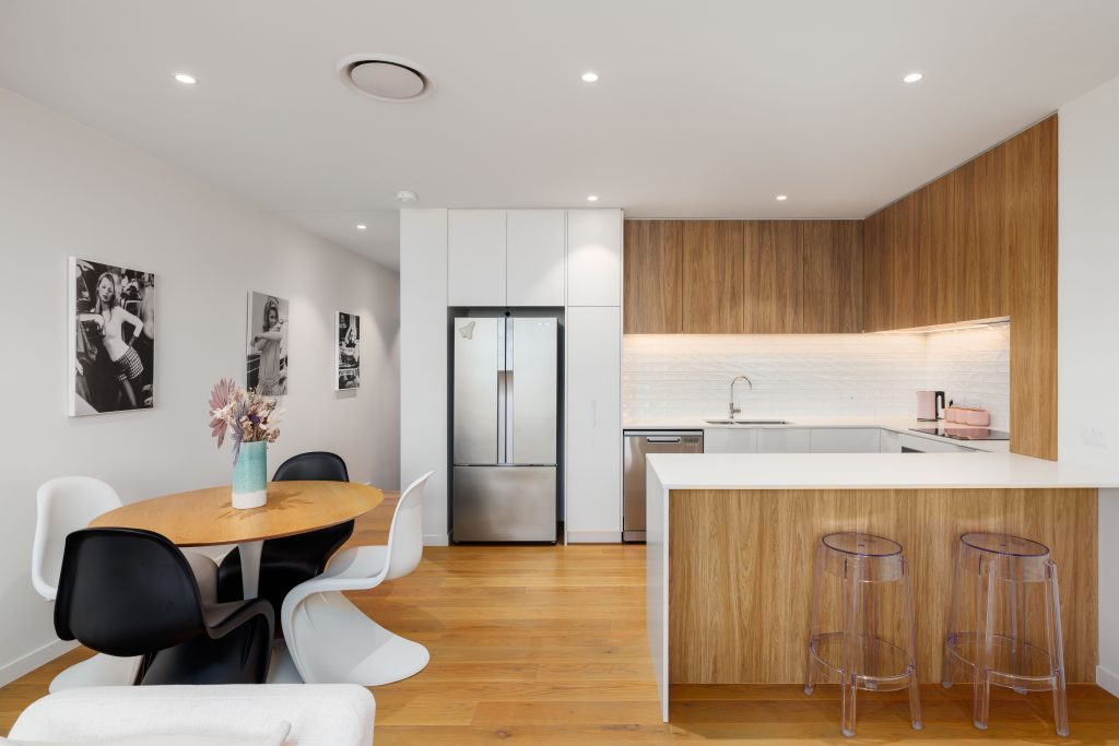 A floor-to-ceiling slider floods this space with sunlight, effortlessly connecting to a west-facing courtyard that enjoys views of neighbouring Rauora Park.