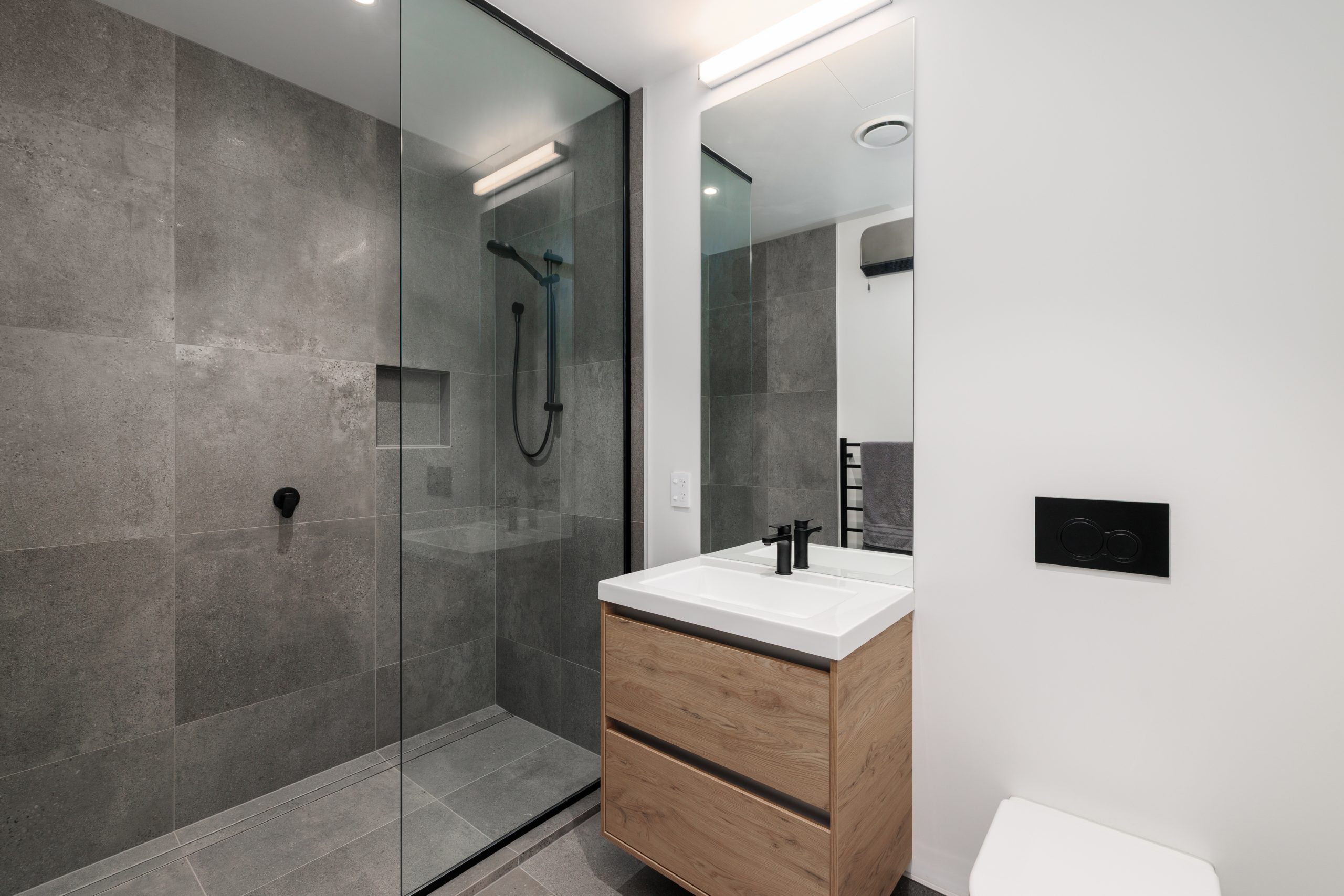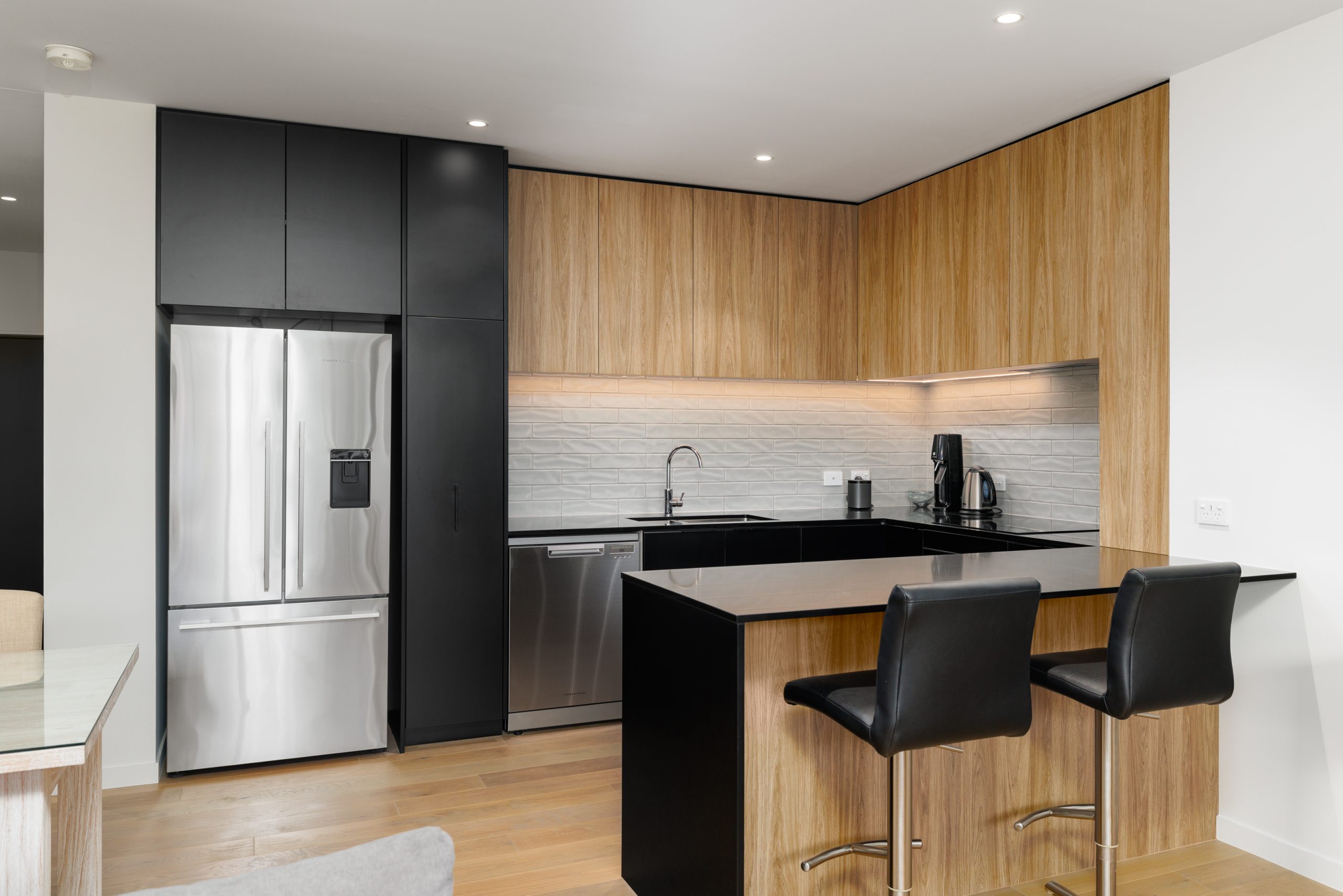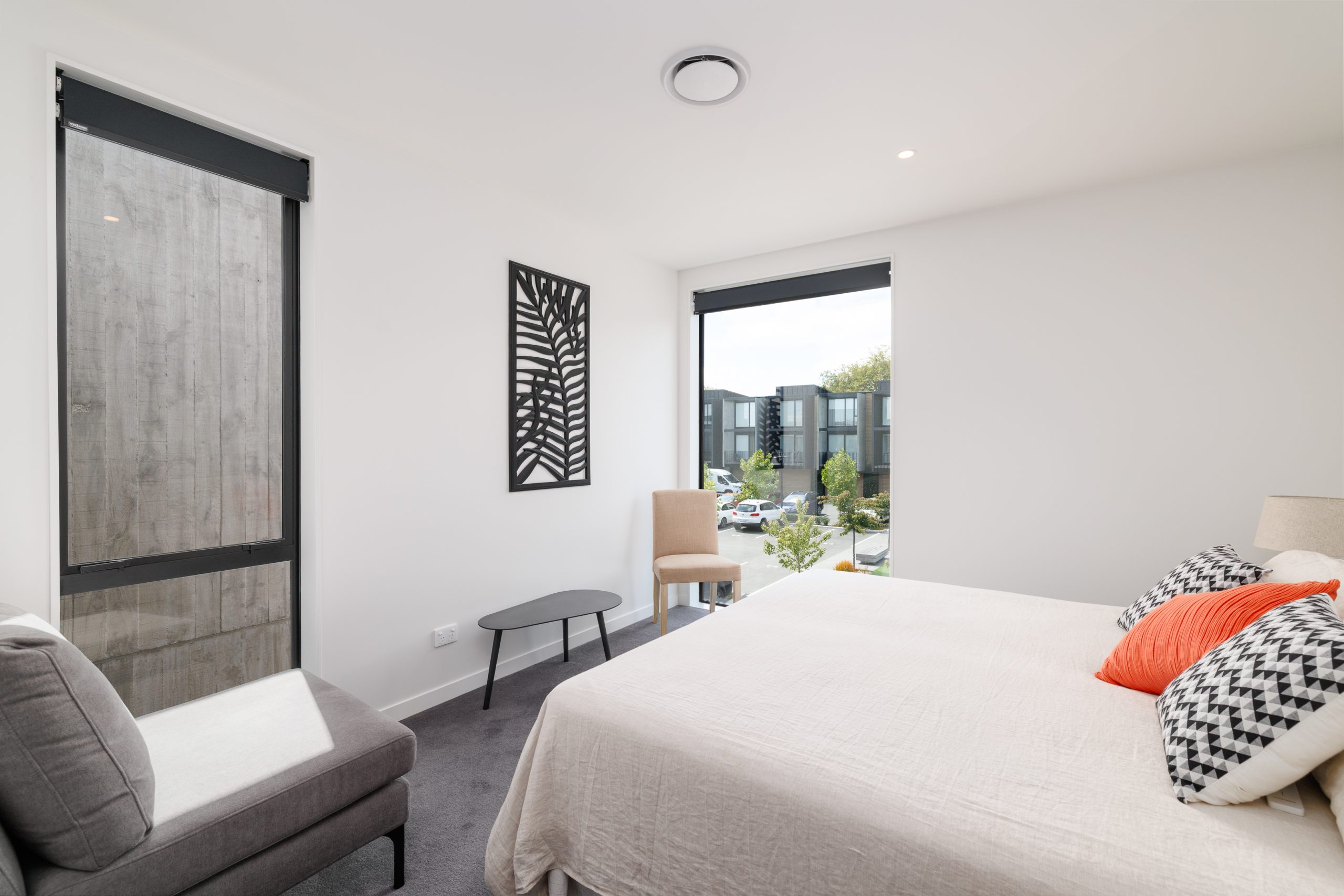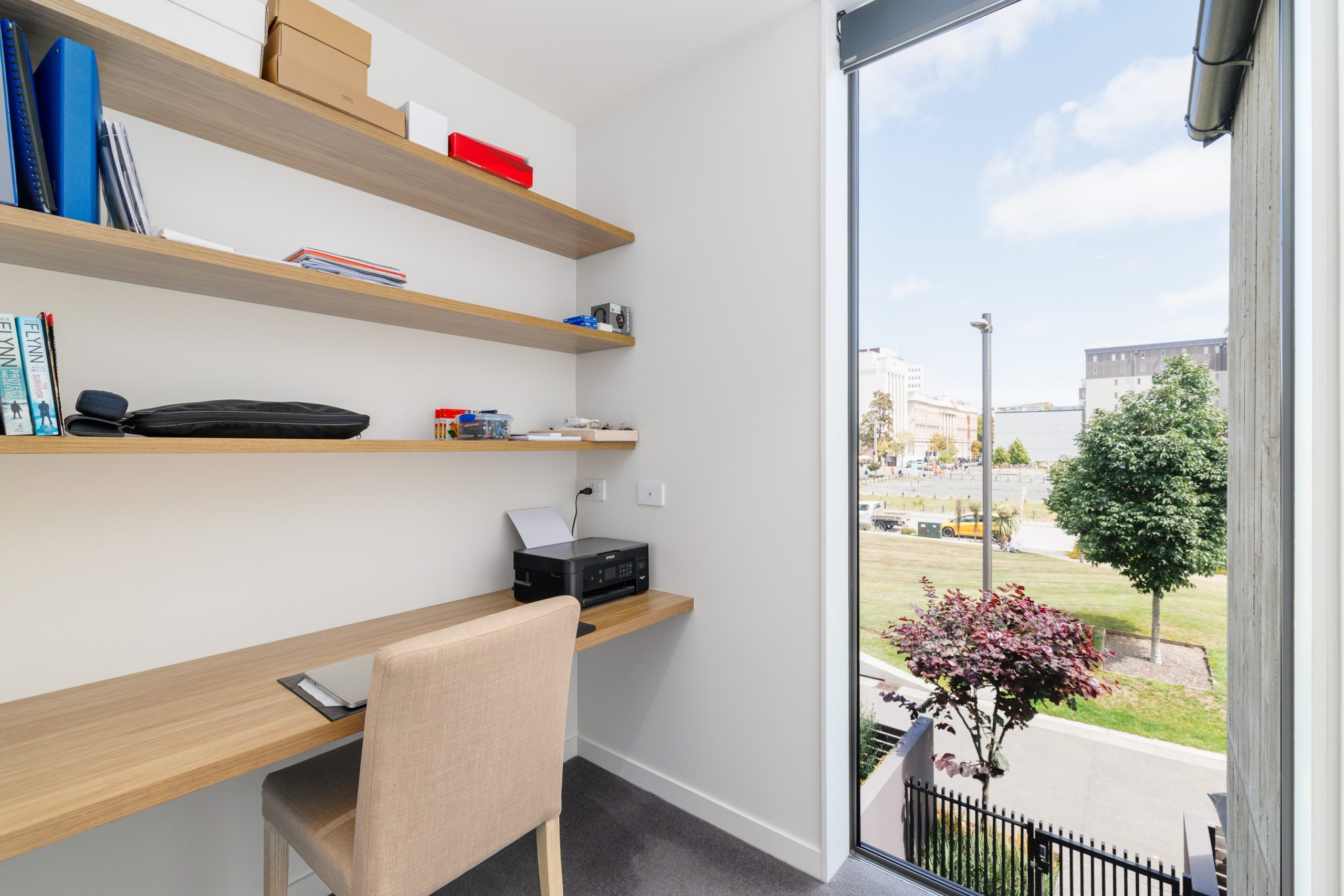 Designed for effortless daily living, this two-level layout places functionality at the forefront. The open-plan kitchen, living and dining area extends to a sheltered courtyard that remains undisturbed by the easterly, while full-height glazing ensures a seamless outlook to Rauora Park.