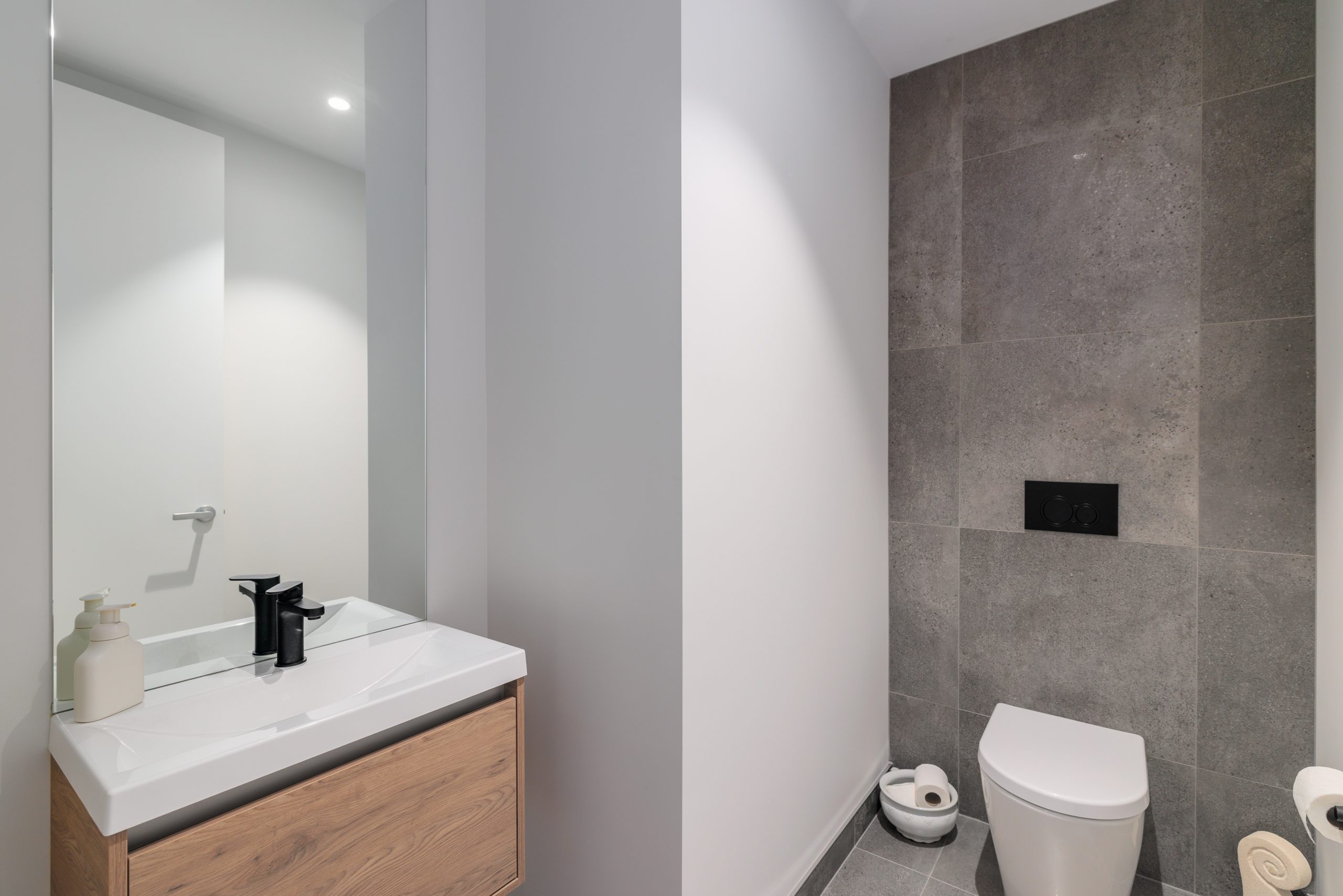 A ground-floor powder room prioritises ease, while the top floor is reserved for accommodation, offering three double bedrooms, a tiled bathroom and a study nook, including a master elevated by a walk-through wardrobe leading to an ensuite.
