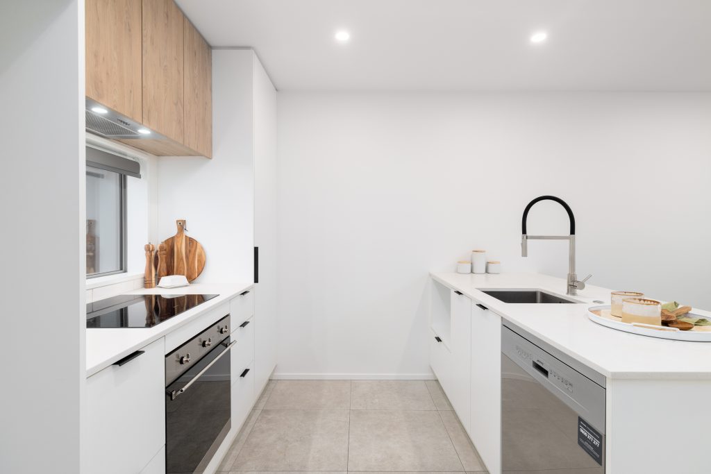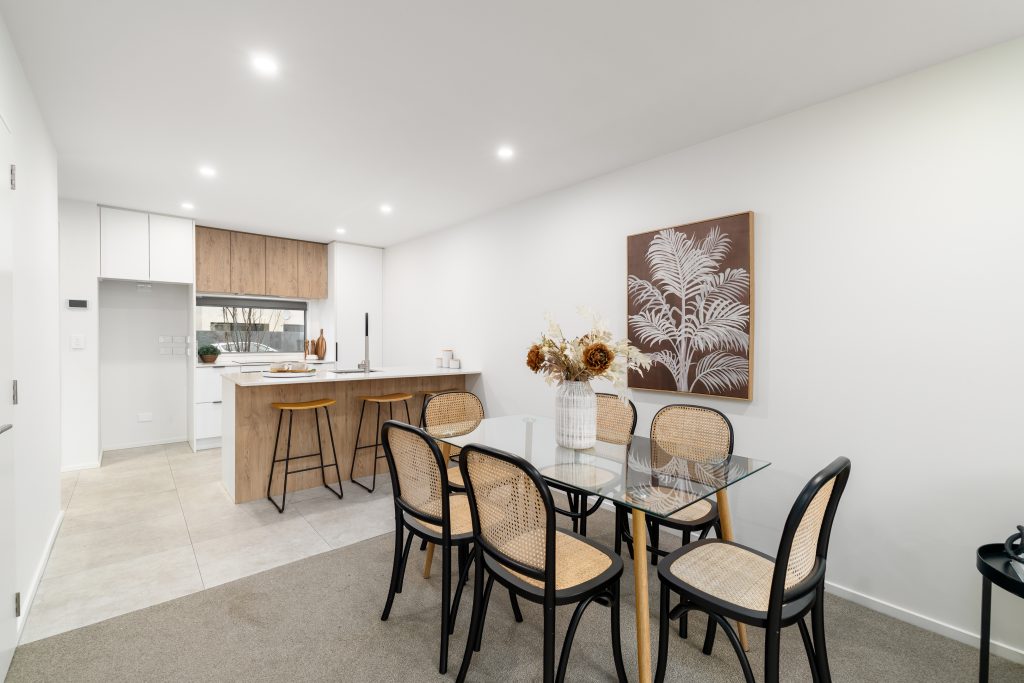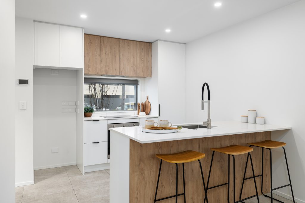A modern kitchen with a breakfast bar anchors the open-plan living and dining zone, where a stacker door connects to a private deck and courtyard that favours unwinding over upkeep.