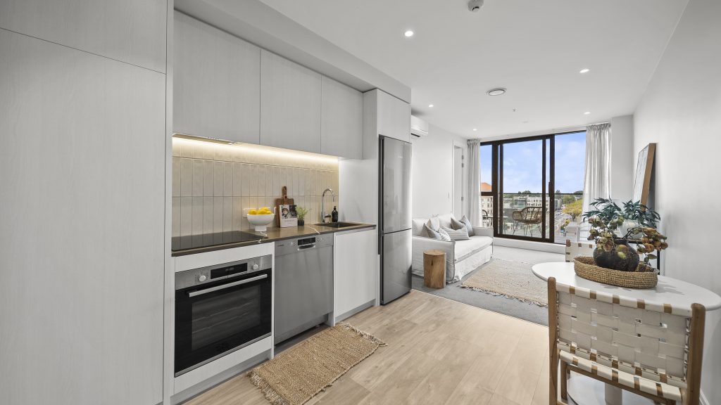 The apartment’s efficient layout includes a bedroom with an ensuite and walk-in wardrobe, complemented by an open-plan kitchen and living area that extends onto a balcony with views of iconic city landmarks.