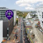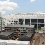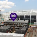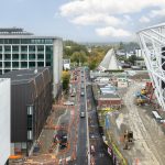 Full-height sliders connect the open-plan kitchen, living, and dining zone to a covered deck, extending the sense of space, while the bedroom captures the stadium in full view – a