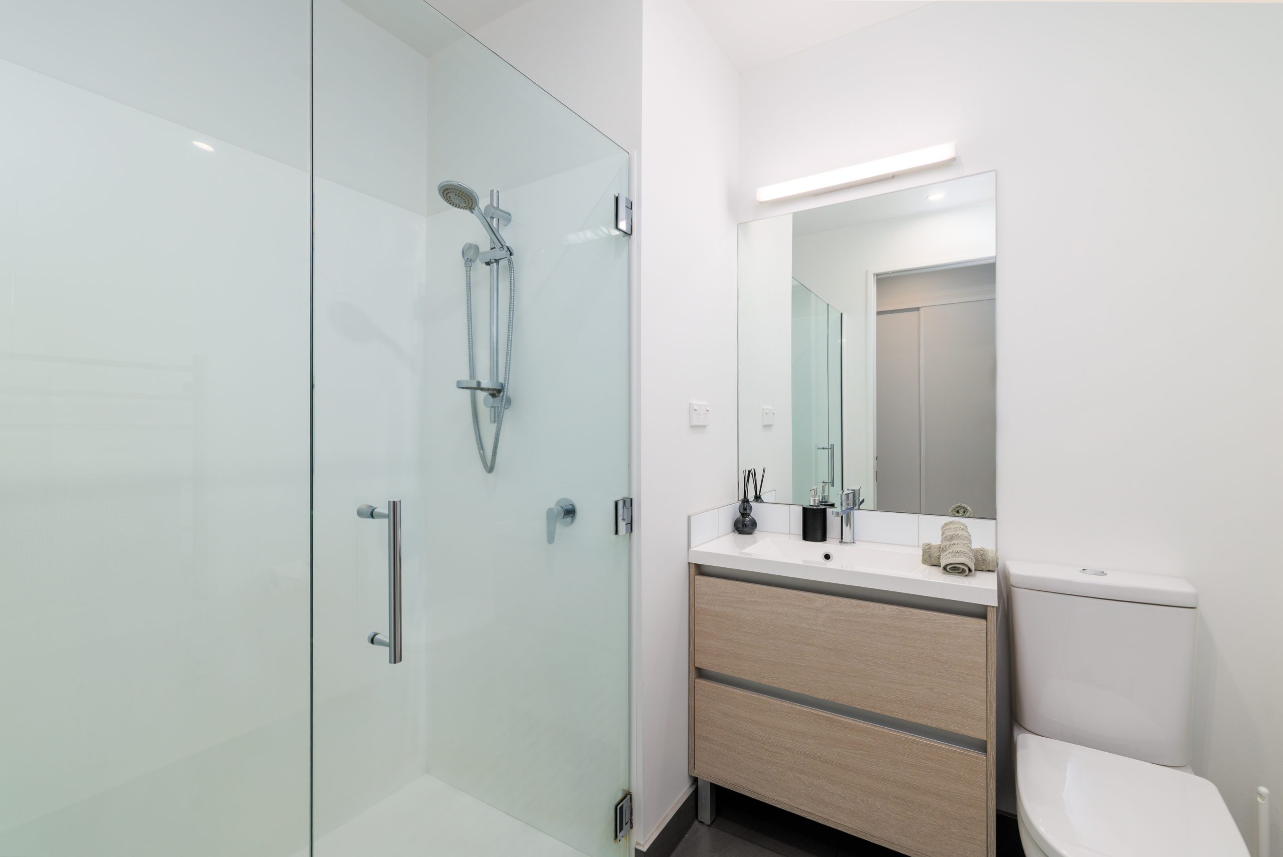 A heat pump delivers year-round comfort, with an integrated laundry nook opposite the modern bathroom, keeping things streamlined behind the scenes.