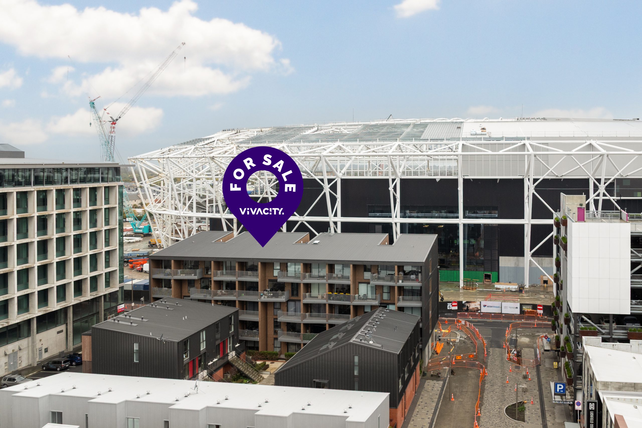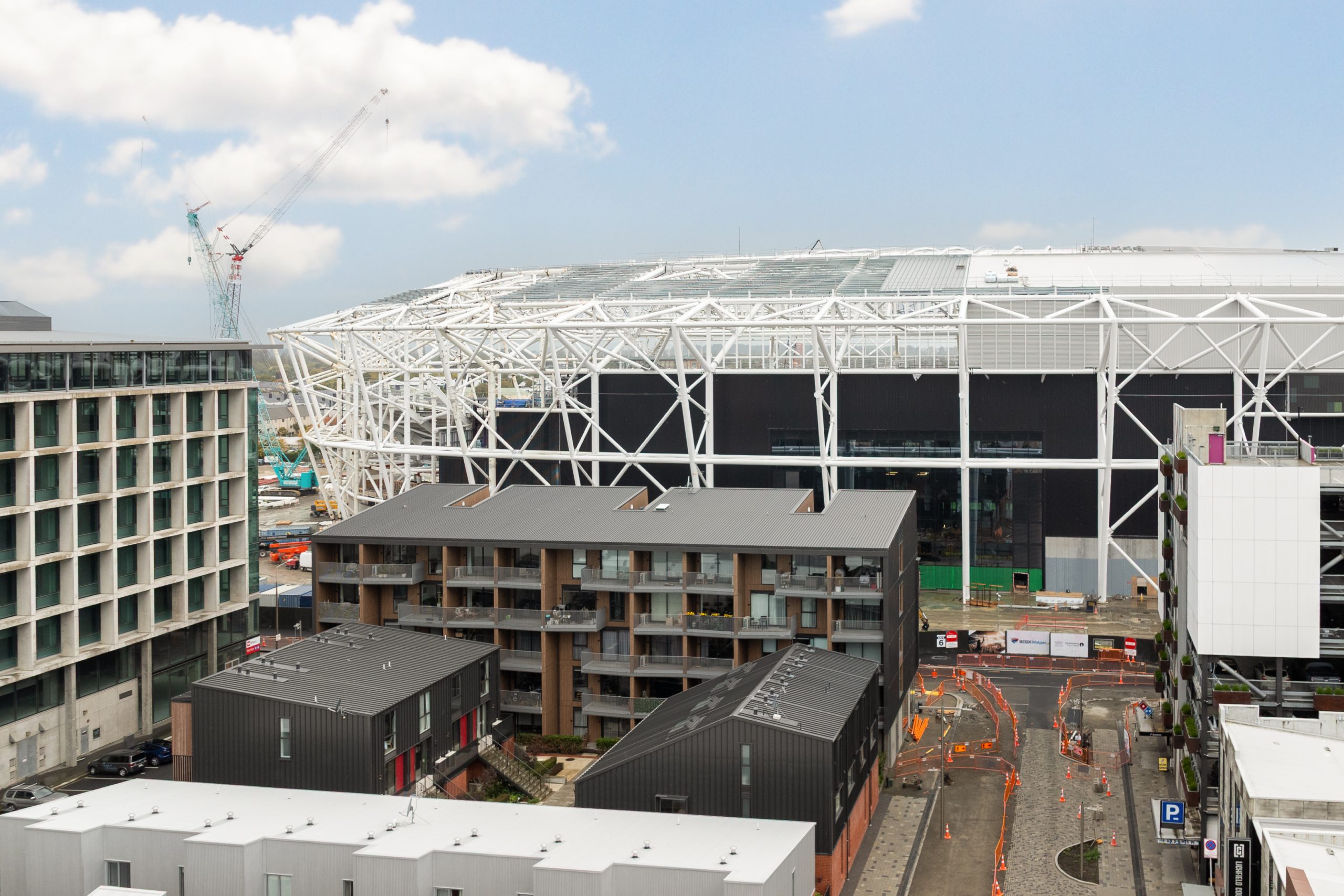 Full-height sliders connect the open-plan kitchen, living, and dining zone to a covered deck, extending the sense of space, while the bedroom captures the stadium in full view – a