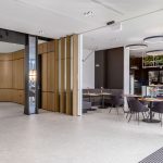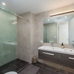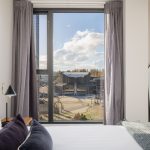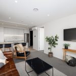 The smartly structured layout hosts two bedrooms and two bathrooms, including a master bedroom complete with an ensuite. The open-plan living and dining zone, encompassing the kitchen with stone countertops, unfolds onto a balcony with scenic views across local landmarks, the Town Hall and Victoria Square.