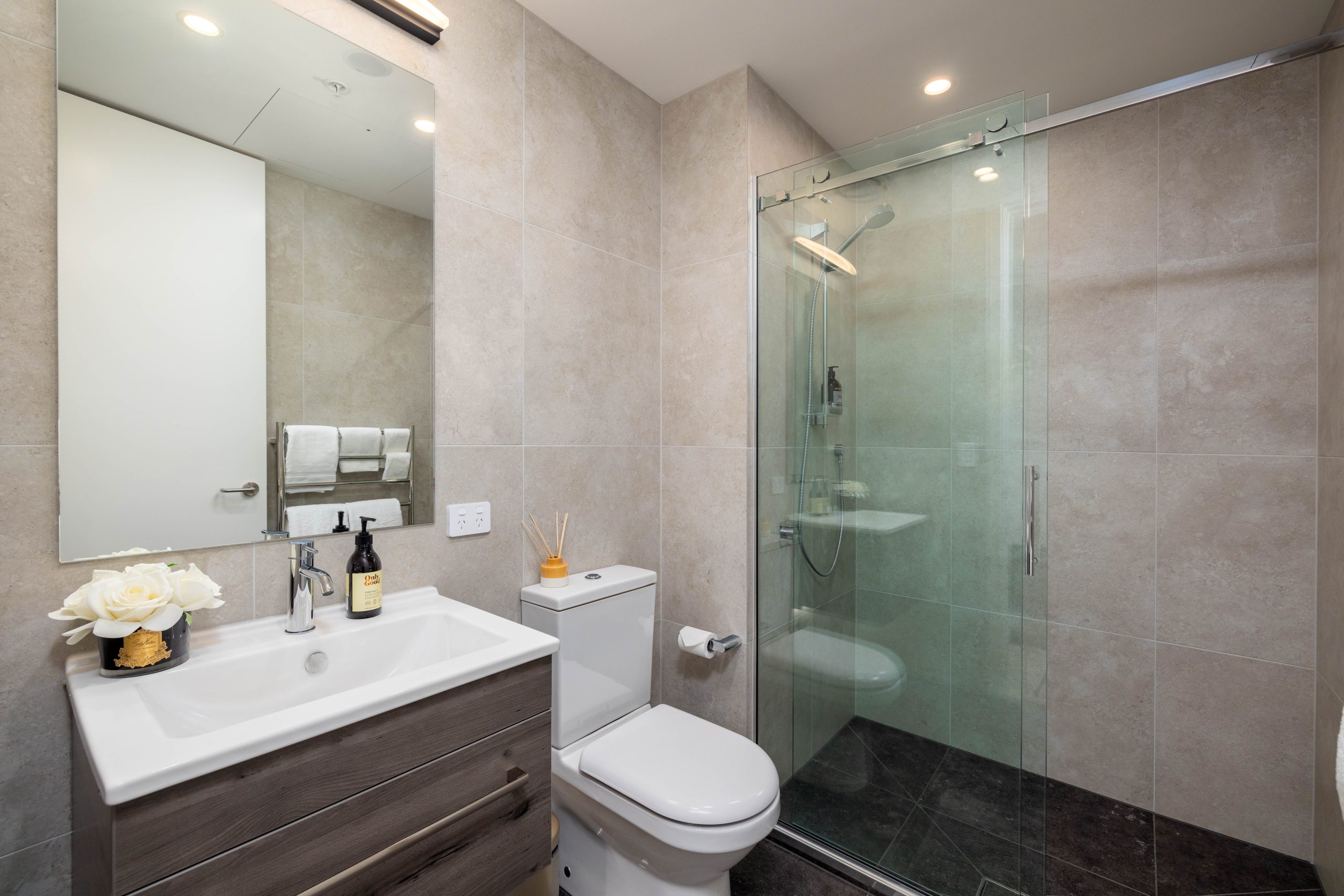 The smartly structured layout hosts two bedrooms and two bathrooms, including a master bedroom complete with an ensuite. The open-plan living and dining zone, encompassing the kitchen with stone countertops, unfolds onto a balcony with scenic views across local landmarks, the Town Hall and Victoria Square.